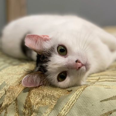 He loves to play with his kitten friends and chase after toys, always finding ways to make his people smile. When he’s done playing, he’s happy to curl up for a nap or snuggle in for some love. Button is just an all-around happy little guy with a big heart.