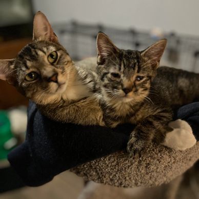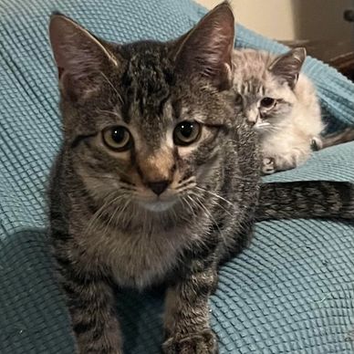Marcella is gentle, affectionate, and resilient. After surviving a tough start and emergency surgery, she’s blossomed into a sweet, loving companion who adores quiet snuggles and cozy naps. Johnny Cash, on the other hand, is full of playful energy and charm—he loves people, toys, and adventure but always finds time to cuddle up when he’s done exploring.