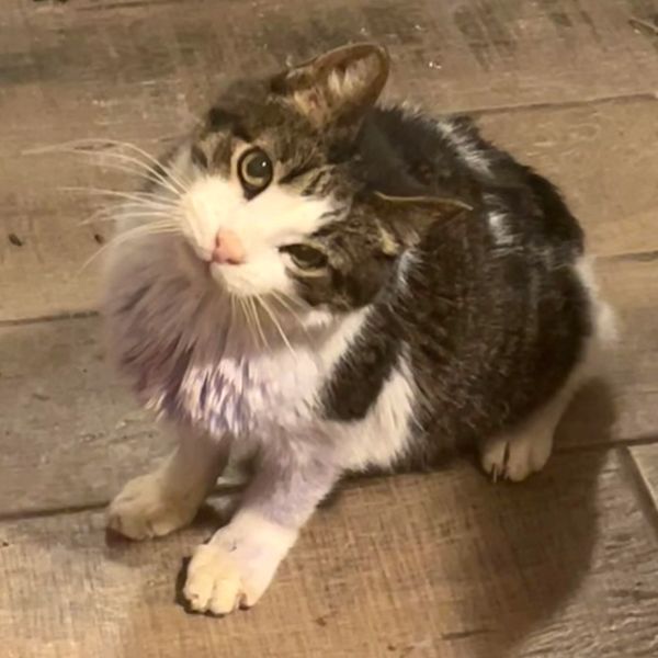He’s incredibly affectionate and loves being petted, snuggled, and brushed. Because of his condition, Tin Can needs a little help staying clean, but he enjoys the extra grooming and attention. He’s also still sporting a faint blue tint on his fur—likely from a run-in with farm animal marking ink, which just adds to his charm.