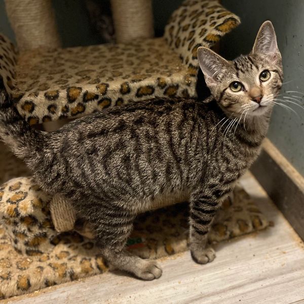 Meet Paisley, a stunning feline with gorgeous swirl markings that make her truly one of a kind. This beautiful girl has not only a striking appearance but also a heart full of sweetness and warmth. Paisley absolutely adores back scratches and will happily nuzzle up to you for more, purring contentedly as she enjoys the affection.